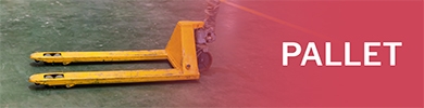 Gele palletwagen met dubbele vorkwielen op betonnen vloer, tekst ‘PALLET’ op rode achtergrond